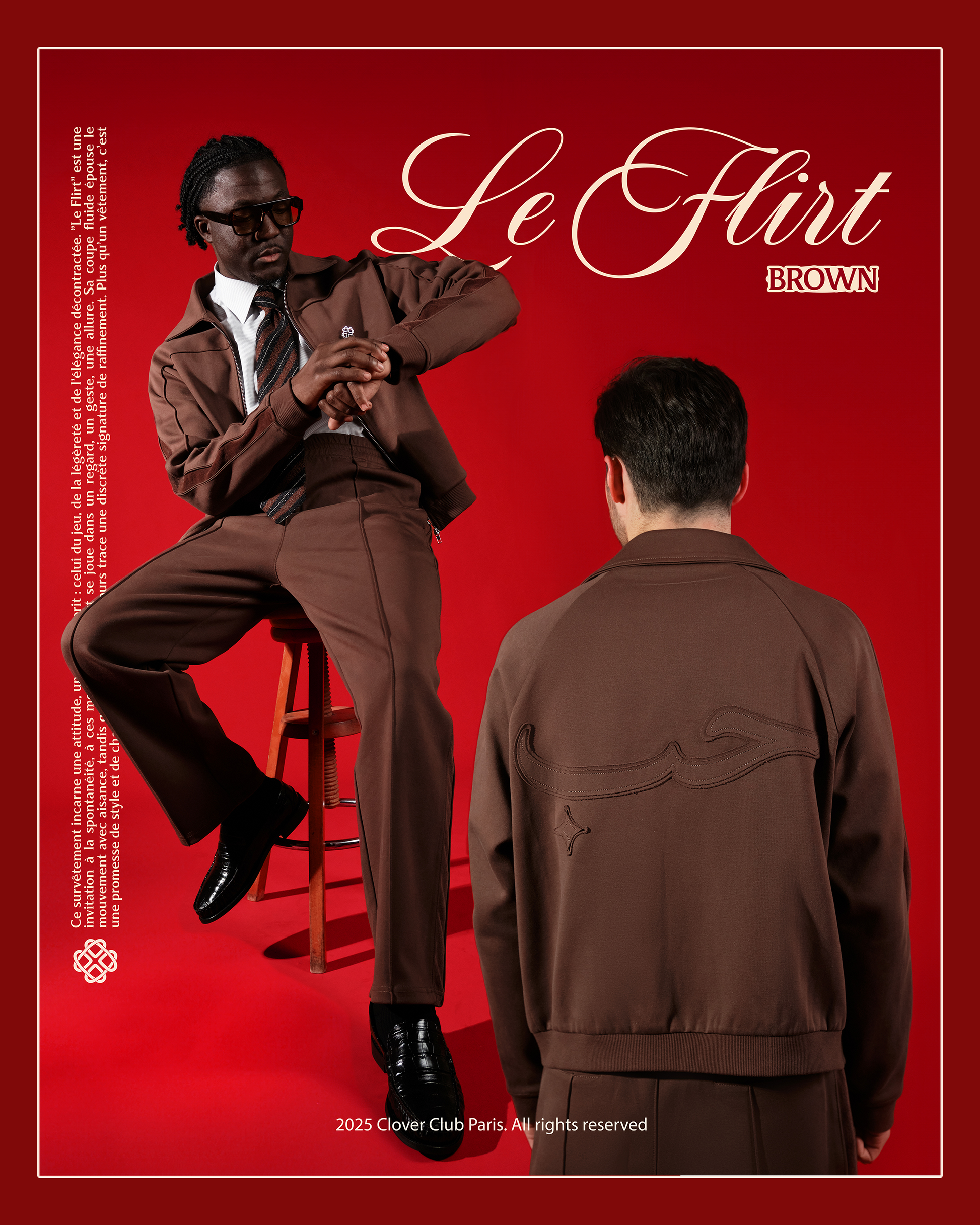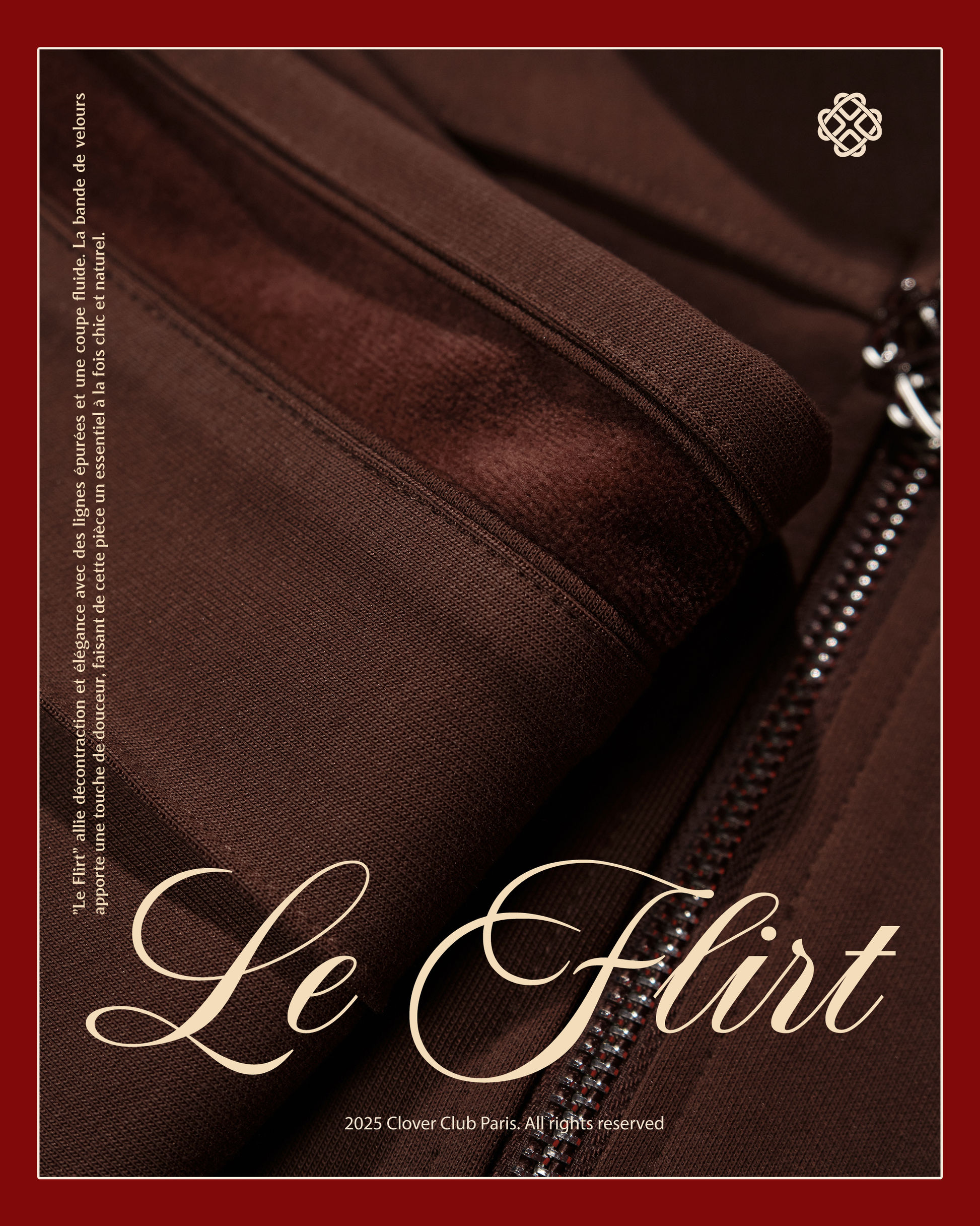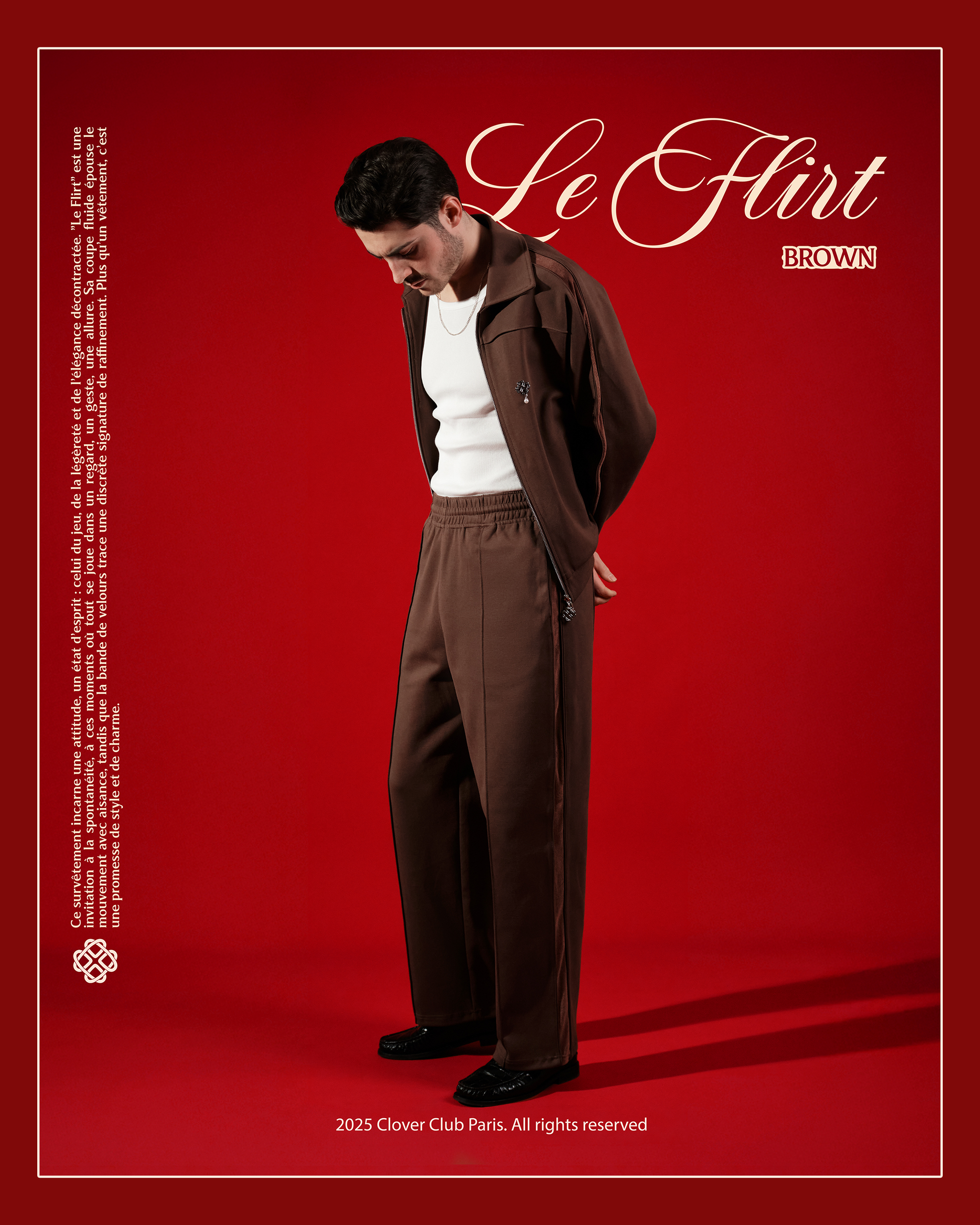 Ce survêtement incarne une attitude, un état d'esprit: celui du jeu, de la légèreté et de l'élégance décontractée. "Le Flirt" est une invitation à la spontanéité, à ces moments ou tout se joue dans un regard, un geste, une allure. Sa coupe fluide épouse le mouvement avec aisance, tandis que la bande de velours trace une discrète signature de raffinement. Plus qu'un vêtement, c'est une promesse de style et de charme.